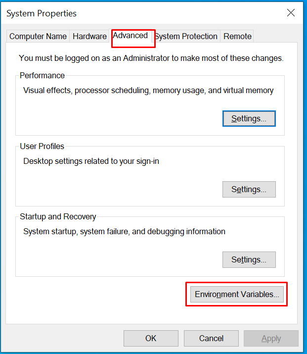 - ★ Go to the “Advanced” tab and click on the “Environment Variables” button.