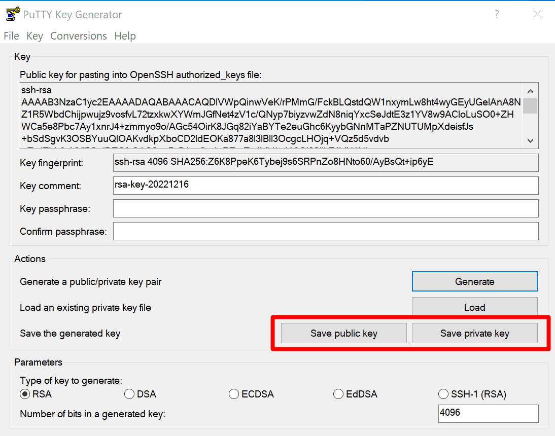 - Now set the necessary parameters in the PuTTYgen surface. The following parameters are necessary to create a key: RSA and one Bit length of 4096. Then click on „Generate“.