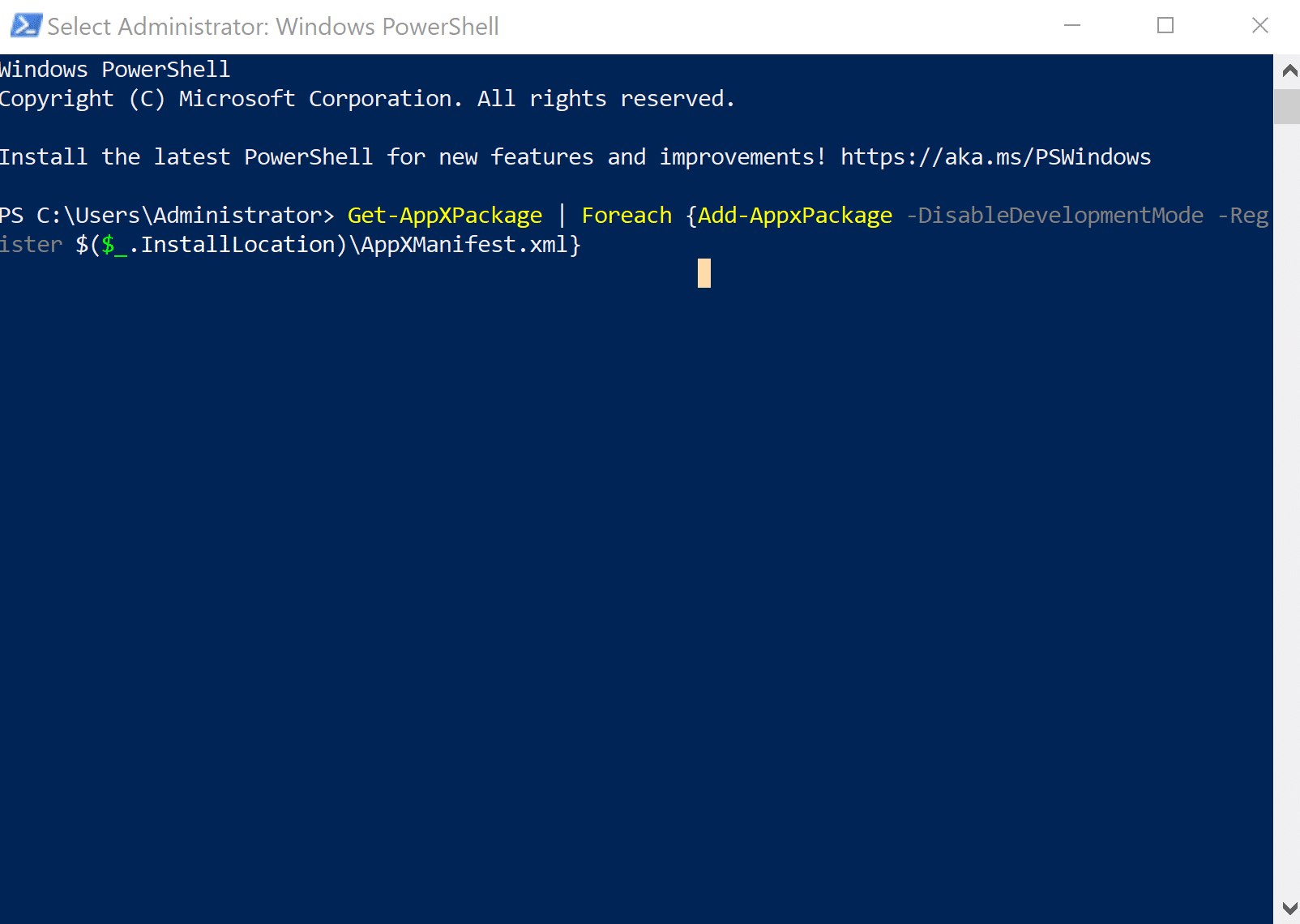 Now type ” Get-AppXPackage | Foreach {Add-AppxPackage -DisableDevelopmentMode -Register “$($_.InstallLocation)\AppXManifest.xml”} “ and press [Enter] . All default apps will now be reinstalled. Then reboot.
