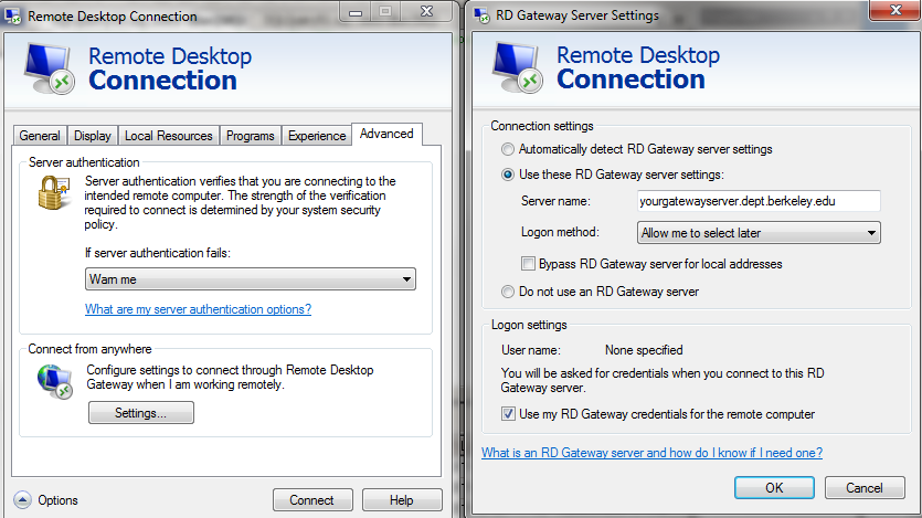The RDP Gateway Service also supports the new Remote Access Services requirement of the draft MSSND update (requirement 8), which requires the use of an approved service (i.e., RDP gateway, dedicated gateway, or bSecure VPN) for access to the UC Berkeley network from the public Internet.