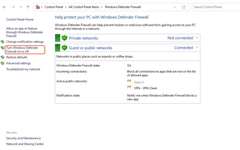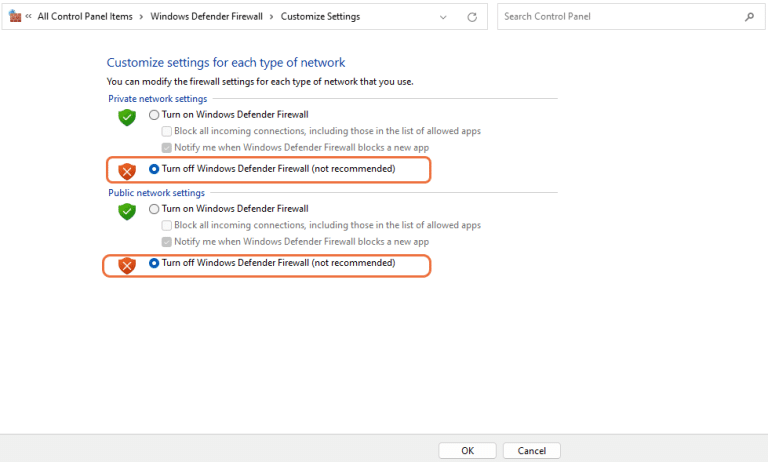 - Turn off the Firewall: In the left-hand menu, click “Turn Windows Defender Firewall on or off“. Then, check the option “Turn off Windows Defender Firewall (not recommended)” for both private and public network settings.