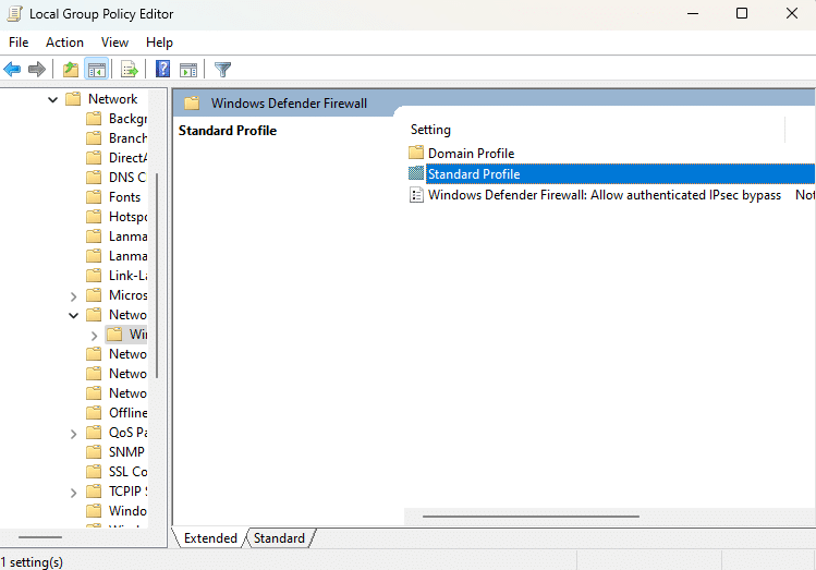 4. Choose “Windows Defender Firewall” and then “Standard Profile“.