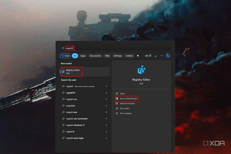 - In the Windows 11 Start Menu, type Regedit into the search bar and select the Run as administrator.
