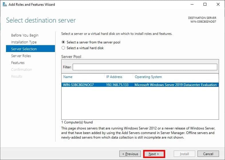 - On the “Select destination server” page, select the server where you want to install IIS and click “Next”.