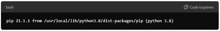 pip 21.1.1 from /usr/local/lib/python3.8/dist-packages/pip (python 3.8)